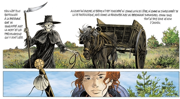 La mort est là juste avant que la vie reprenne le dessus. Personnage symbolique de la Bretagne, l’Ankou, qui est l’ouvrier de la Mort, me permet de faire le lien entre les récits. Les chemins de Compostelle étaient très dangereux au moyen âge par exemple, on pouvait se faire égorger au détour d’un chemin !