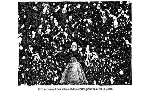 Le trait fin et les lignes géométriques donnent aux décor un aspect grandiose et impérieux. Les nuances de noir et blanc travaillées illuminent le dessin et renforcent le récit. Evoquant les gravures de Gustave Doré, qui a aussi illustré la Bible, Arispe innove et mystifie l’image en jouant sur les interprétations multiples et la sollicitation directe du lecteur. Les personnages, souvent de face, incluent celui-ci dans une histoire immersive et participative.