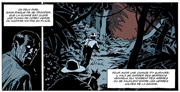 Dès les premières pages, le trait simple et anguleux marque, souligné par la colorisation particulièrement riche dans ses nuances. Dans un découpage sobre aux atmosphères parfaitement maîtrisées, la moiteur de Cayenne, peu propice à l’espoir, éclate au fil des pages