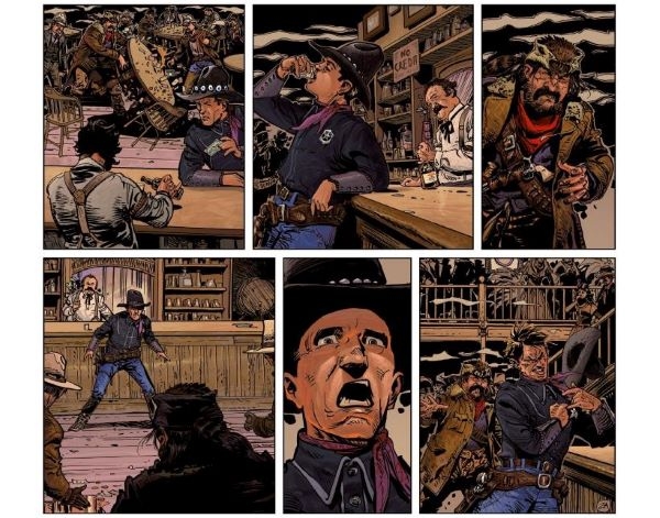 Son amour du western et des grands espaces éclate à chaque page et sa façon de rendre les paysages de la région des Fours Corners (point de jonction entre les états du Colorado, de l’Utah, de l’Arizona et du Nouveau Mexique) est tout simplement magnifique. Comment ne pas s’empêcher de penser à Jean Giraud et à Blueberry dont il a parfaitement assimilé l’art et la technique ? Saluons aussi le travail sur la couleur et la lumière de Jean-Paul Fernandez, impeccable.