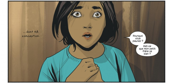 Après une fin de septième tome difficile, Vaughan s'attarde longuement sur la notion de famille et sur la façon dont chacun fait son deuil d'un enfant pas encore né. Certes, assez peu de personnes réagissent en lançant des flammes par les doigts, mais de manière générale le lecteur est en empathie totale avec ces personnages, en lutte contre l'univers entier mais dont les liens semblent les rendre plus forts que tout.