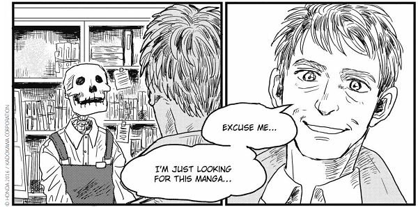 Honda-san travaille à l’étage manga d’un des nombreux immeubles-librairies qui parsèment le Japon. Crâne grimaçant en guise de tête, récurrente sueur froide d’angoisse et lombaires complètement détruites, la libraire a appris à aimer son travail dans la douleur. Elle côtoie au quotidien une poignée de collègues aux allures de parade d’Halloween qui sont vite devenus des compagnons de galère autant que des sauveurs providentiels à mesure que les arrivages s’empilent. Sa principale tâche ? Maintenir à flot les rayons dont elle a la charge, louvoyant entre fournisseurs en pénurie, clients aux requêtes farfelues, stocks monstrueux et commerciaux débonnaires.
